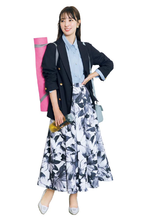 ネイビージャケットと合わせれば、シックな花柄スカートの凛とした華やぎが増すよう♡ジャケットのインはライトブルーのシャツできちんと感を高めると、頼れる大人な先輩として後輩の目に映るはず。