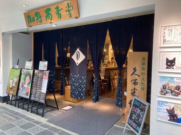 今日ご紹介するお店は、世界的ブランドのハーブティーや珈琲を提供してくれるカフェ・加野而青堂(かのにしょうどう)さんです。久留米絣の暖簾を一歩くぐれば、参道のにぎやかさから一転ゆっくりとした空間がひろがっています。こういう雰囲気もお客様に大人気のお店です。