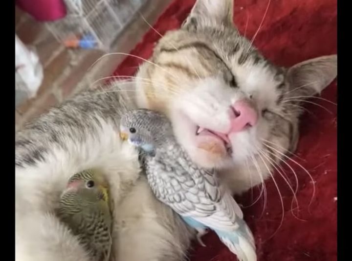 熟睡している猫、アゴの下や腕の中に鳥さんが集まってきて