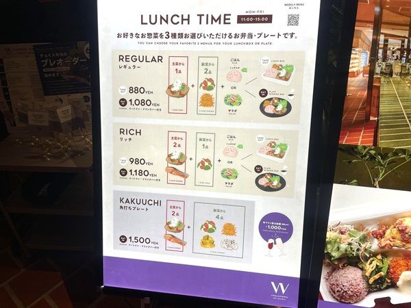 ランチメニューは3種類あり、好きなお惣菜を自由に組み合わせることができます。イートインで楽しめるプレート「レギュラー」(1,080円)は主菜から1品、副菜から2品、ごはん+ミニサラダもしくはサラダ、そしてドリンクバーが付いてきます。「リッチ」(1,180円)は主菜から2品、副菜から3品、ごはん+ミニサラダもしくはサラダ、そしてドリンクバー、そして「角打ちプレート」(1,500円)は主菜から2品、副菜から4品というおかずメインのプレートです。