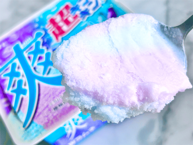 蓋をめくると、淡いパープルとブルーの2色の鮮やかなアイスがお目見え。涼やかで、夏にぴったりな色合いですね。