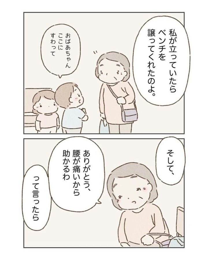 6歳の息子は、座っていた席を「ここに座って」と、おばあさんに譲っていました。さらにそれだけではなく、息子は腰が痛いというおばあさんを心配し、優しく腰をさすってあげていたとのこと。