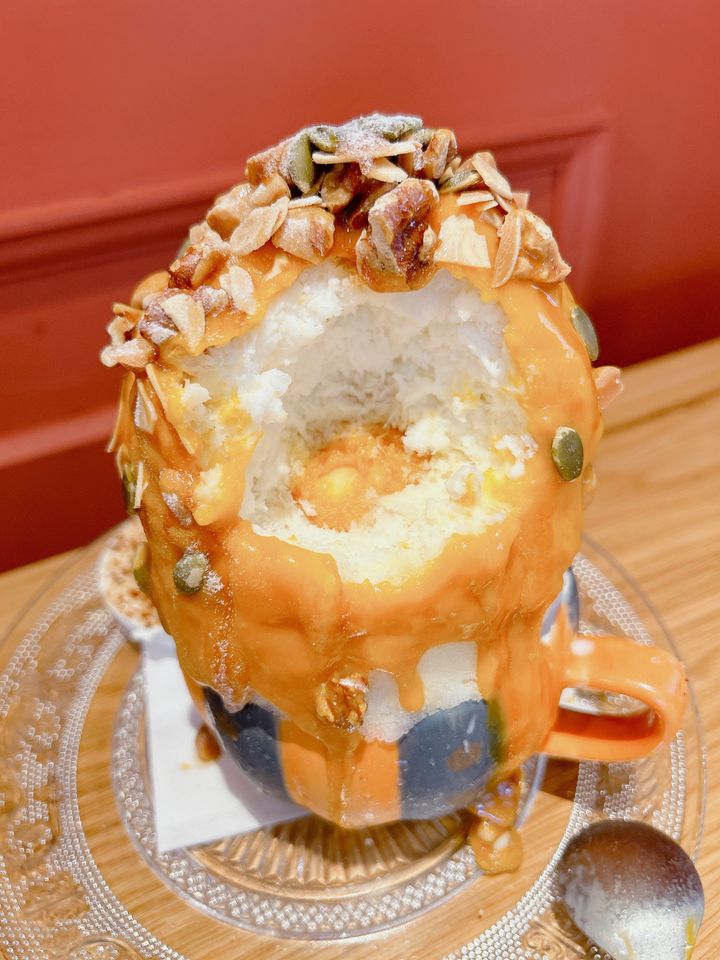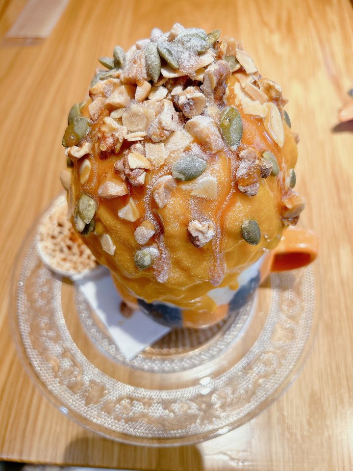 ざくざくとした氷ではなくやわらかい質感の氷に、とろっと甘いかぼちゃのソースとキャラメルがかかっています。そして香ばしいナッツがベストマッチです☆