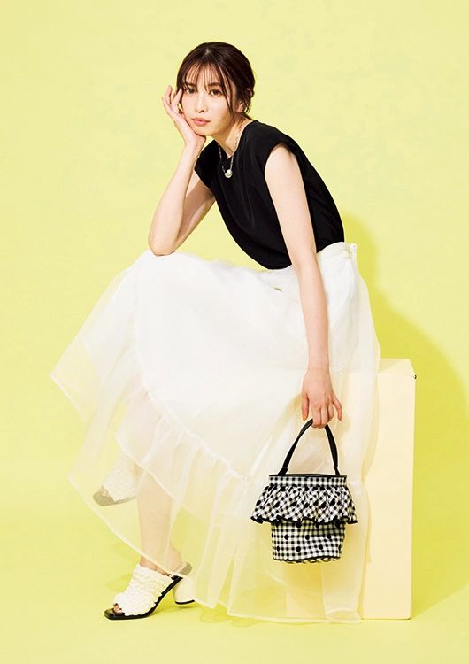 チュールスカート¥23,100/マイストラーダ ブラウス¥41,800/ボーダーズ アットバルコニー イヤリング¥4,180/mimi33(サンポークリエイト) ネックレス¥24,420/ポレット フェルン(ロードス)バッグ¥42,900/セツコ サジテール(サジテール) サンダル¥18,700/ラベルエチュード