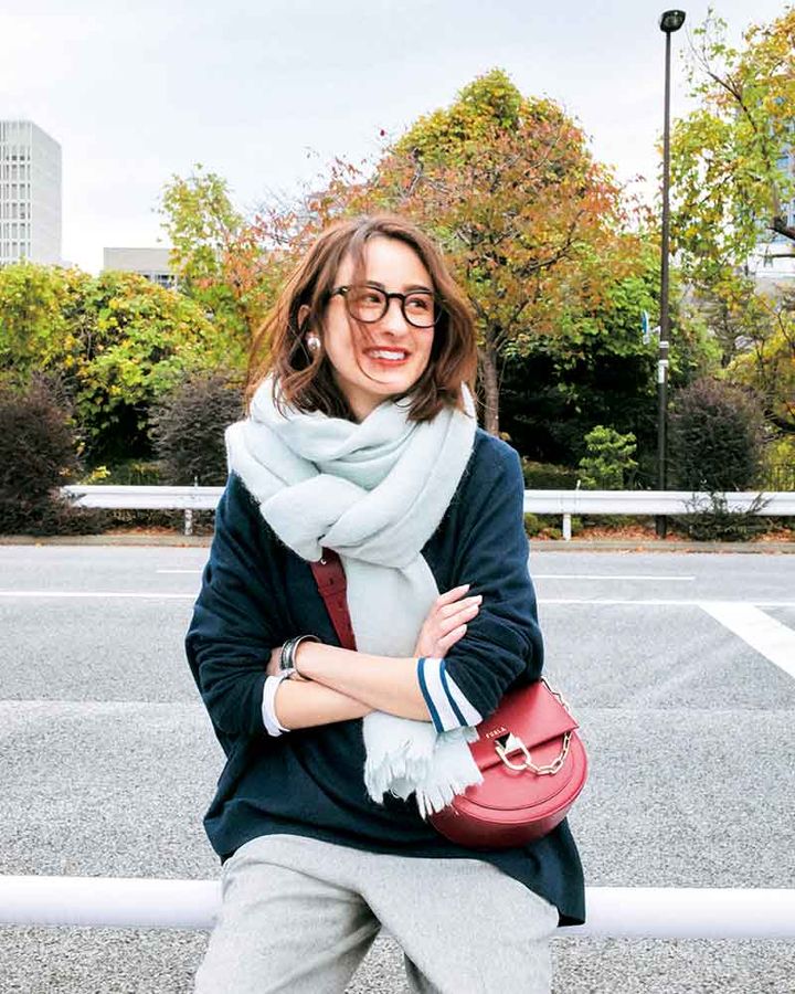 顔に触れるものだから、やっぱり上質さにこだわりたい。ふんわり柔らかな淡色ストールは暖かいのはもちろん、顔色を明るく見せてくれる効果も。たっぷりサイズが自然なボリュームを作り、リッチに見せてくれます。ストール¥29,000(アソースメレ/アイネックス)ニット¥28,000(アパルトモン/アパルトモン 青山店) ボーダーカットソー¥11,800(ルミノア/ジャ ーナル スタンダード 表参道)パンツ¥52,000(YLÉVE/ザ ストア バイシー 代官山店)バッグ¥54,000(FURLA/FURLA JAPAN)メガネ¥27,000(アイヴァン/アイヴァン PR)イヤリング¥2,864(アビステ)バングル¥29,000(ノース ワークス/UTS PR)