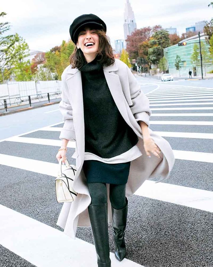ロングスカートが主流の今だけど、タイツの季節ならミニだってあり!ブーツを合わせればちゃっかりスタイルUPも。コートの中をダークなワントーンでまとめたら、ニットの下からちらりと白をのぞかせてメリハリを。ミニスカート¥18,000(アンクレイヴ)ブーツ¥59,000(PIPPICHIC/ベイジュ)コート¥62,000 ニット¥23,000(ともにカオス/カオス横浜)カットソー¥14,000(アメリカーナ/アパルトモン 青山店)バッグ¥415,000(ヴァレクストラ/ヴァレクストラ・ジャパン)帽子¥11,000(CA4LA/CA4LA プレスルーム)タイツ¥1,900(靴下屋/タビオ)ブレスレット¥7,000(イン ムード/フォーティーン ショールーム)