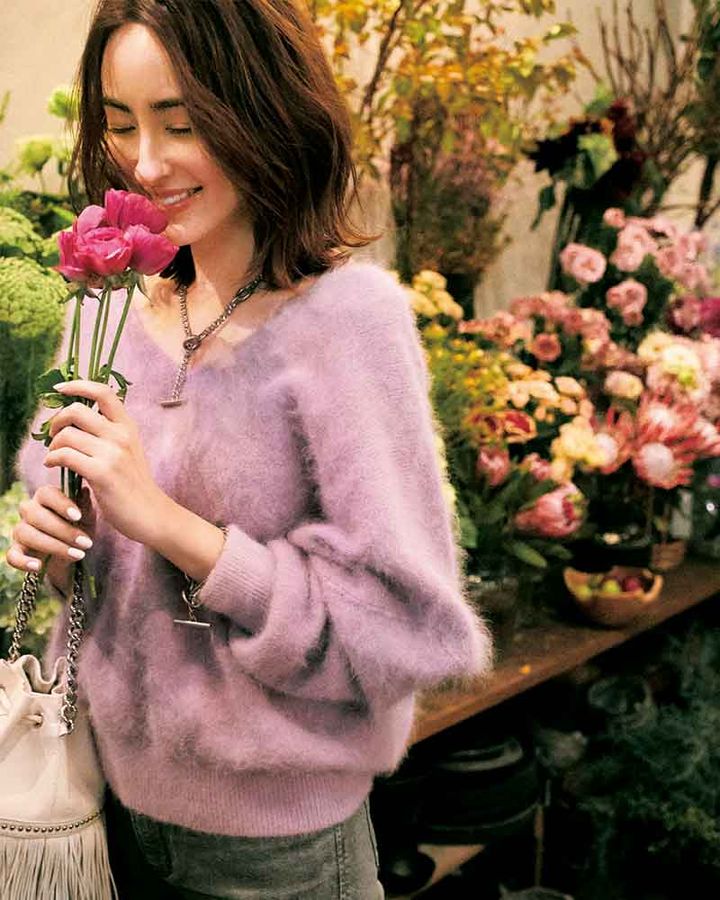 ふわふわのアンゴラニットとパステルカラーの組合せが最高に可愛い。肌色をキレイに見せてくれるライラックは甘さもほどよく、誰からも好印象をキープできます。ニット〔アンゴラ〕¥18,000(ウィムガゼット/ウィムガゼット ルミネ新宿店)デニムパンツ¥23,000(ヤヌーク/カイタックインターナショナル)バッグ¥142,000(J&M デヴィッドソン/J&M デヴィッドソン 青山店)ネックレス¥8,500ブレスレット¥8,500(ともにイン ムード/フォーティーン ショールーム)