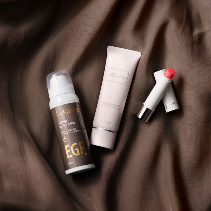 画像左「これは今まで使ってきたミスト化粧水の中で、一番ミストが繊細なんです! 肌当たりが優しいので敏感な肌にも使えます。メーク直しの時もしっかり保湿してから直したいので、毎日欠かせないアイテム。皮膚を再生してくれるEGFも配合されています」(野崎さん)モイストシャインミスト 6ppm 50ml ¥4,950(レカルカ)