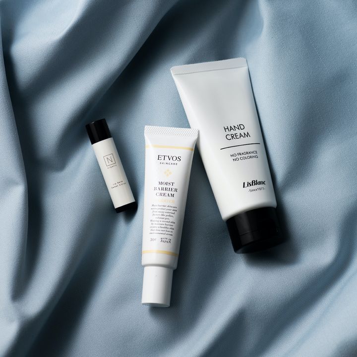 画像中央「冬のスキンケアは顔も身体もセラミドを重ねるようにしています。これはヒト型セラミドが配合されたクリームで、普段のスキンケアにも使えるのですが、メーク直しのときは乾燥が気になるところに塗って保湿をしてから直すようにしています。チューブなので持ち歩きにも便利」(千國さん)エトヴォス モイストバリアクリーム 30g ¥3,850(エトヴォス)