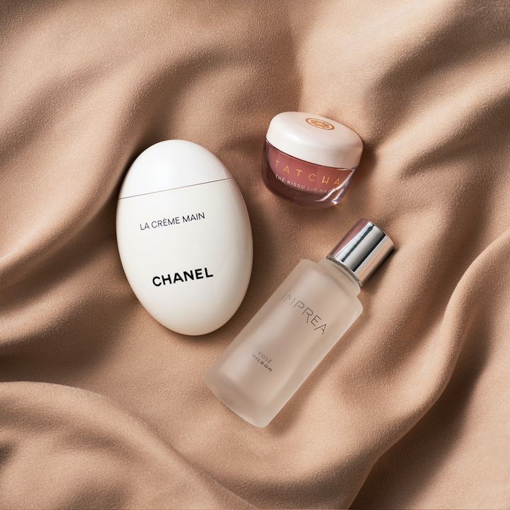 画像左上「このハンドクリームは、ヘアメークさんやスタイリストさんのバッグに入っている率がすごく高いですよね! バッグから出てきたときも気持ちが高まるし、女子力って感じです♡ フローラル系の香りと軽いテクスチャーも好きです」(加治さん)ラ クレーム マン 50ml ¥6,380(シャネル)