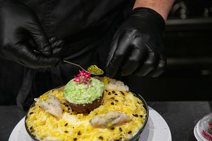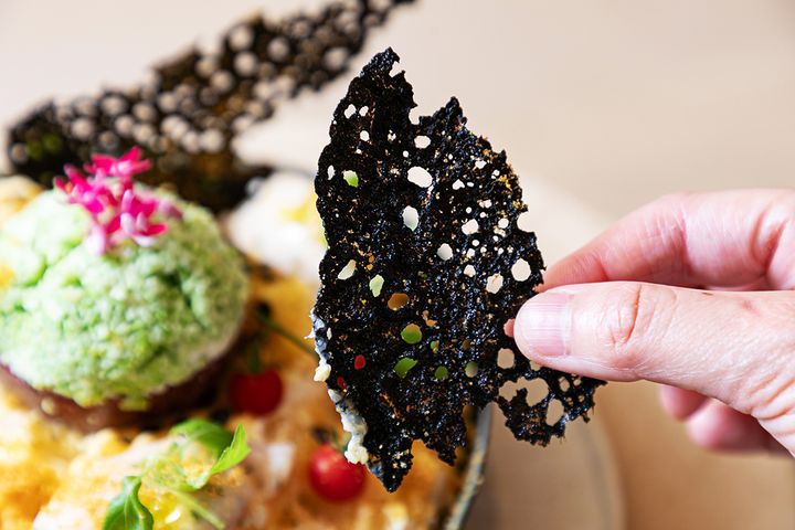 「甘海老なめろうタルタル」の上に、オリーブオイルを閉じ込めてキャビアのような見た目にした「オリーブキャビア」がのせられます。噛むとオリーブオイルがじゅわっと出てきて、風味とプチッとした食感を同時に楽しめます。なめろうとも合いそうです!