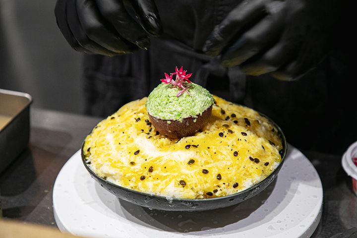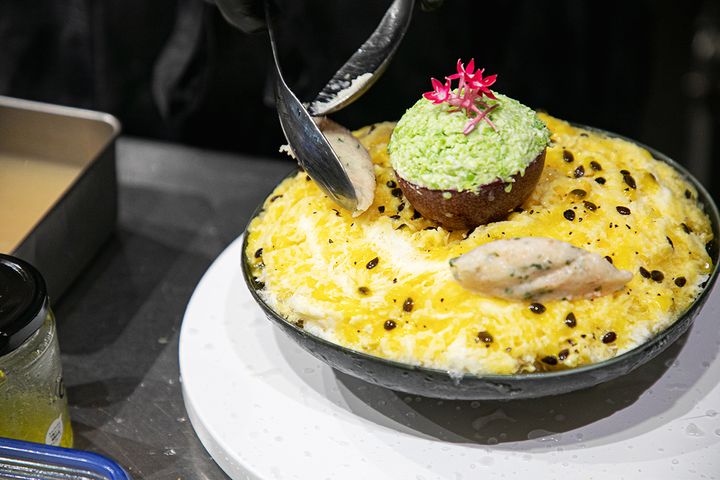 中央のものはアボカド!? と思いきや、違いました。こちらはパッションフルーツの果肉を取り出したものを容器代わりにして、ミョウガのみじん切りである「茗荷シズレ」をベースに、塩麹とずんだをからめてつぶした「塩枝豆ずんだ」を詰めたもの。上にのった鮮やかな花は「ペンタス」。思わず写真を撮りたくなるような、美しい見た目にこだわっているそうです。