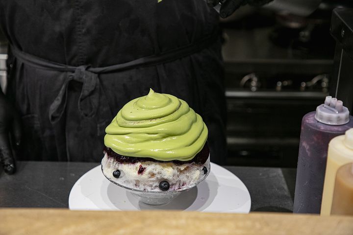 その上から「宇治抹茶エスプーマ」をたっぷりとかけ、最後に「クラッシュパイ」をのせて、完成です。竹中さんが作るかき氷は、どの食材もたっぷりと使われているのが特徴です。