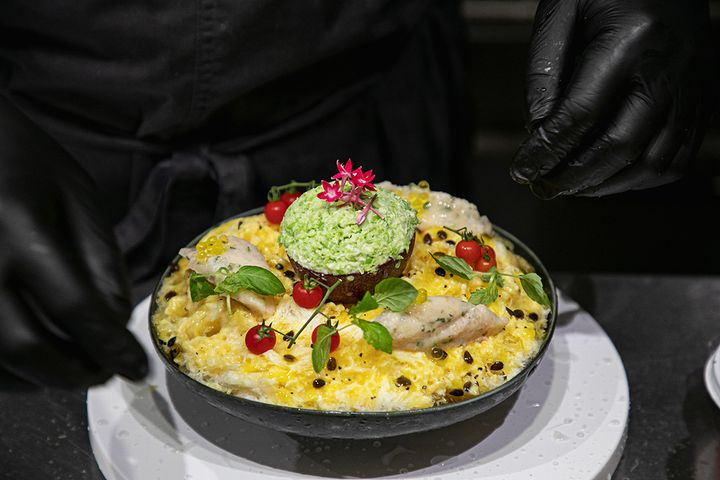 仕上げに「ペリーラ」「マイクロトマト」「カラスミパウダー」が添えられ、完成!