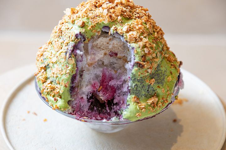 スイーツ要素の強いかき氷のメニューも、もちろんあります。こちらは「ブルーベリー、宇治抹茶、熟成黒みりん、蕨餅のかき氷」。