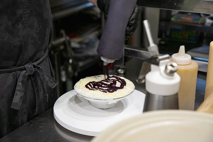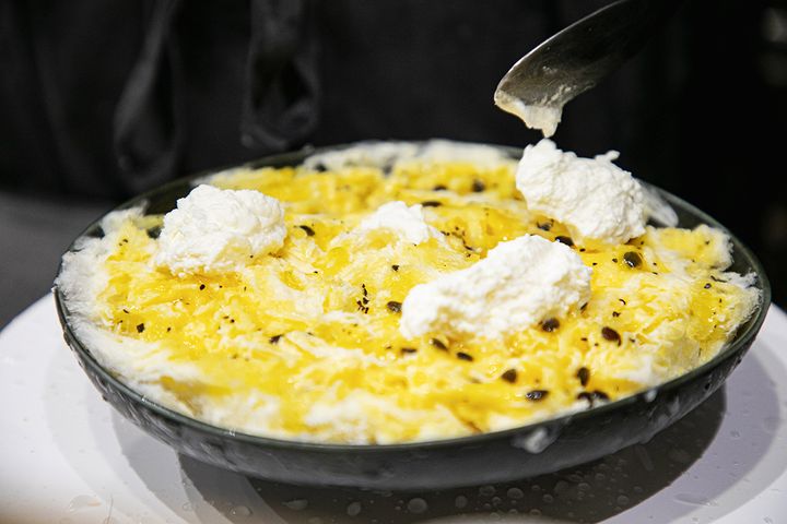カウンター席からは、氷が削られかき氷が作られる工程を見ることができます。どんどん作られるさまを見るのもとても楽しいですよ。ほんのり甘さのある「アングレーズソース」と「パッションフルーツソース」がふんだんにかけられ、その上に「塩麹クリーム」がのせられます。酸味が強く香り高いパッションフルーツには、塩麹の甘じょっぱい風味が合うそうです。