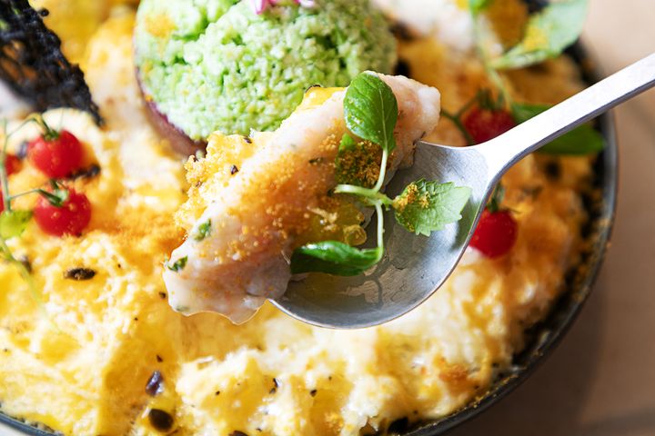 こちらは、「パッシュンフルーツ、甘海老なめろうタルタル、枝豆、出汁醤油のかき氷」。連なる食材名を見るだけでも、本当にかき氷!?と、味の想像がつきません。食材の珍しさはもちろん、見た目の美しさにも注目です。さすがフレンチのシェフが手がけているだけあって、まるでアート作品のよう! こちらのメニューに入っている食材は14種類。食材のひとつひとつが、丁寧に下ごしらえされています。食材数はメニューによっても変わりますが、多いときでは30種類ほどになることもあるとか。