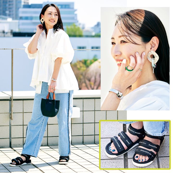 右下:MODE ET JACOMOのグルカサンダルはゴツめのデザインなので、甘めコーデをハンサムにしてくれるし、色が白なので爽やかな印象に。