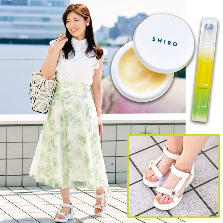 右上:汗の臭いは自分だけでなく周囲にも不快感を与えるので速攻で拭き、リベルタの冷感スティックで首筋を冷やします。SHIROの練り香水はサボンの清潔感あふれる香りが◎。