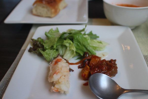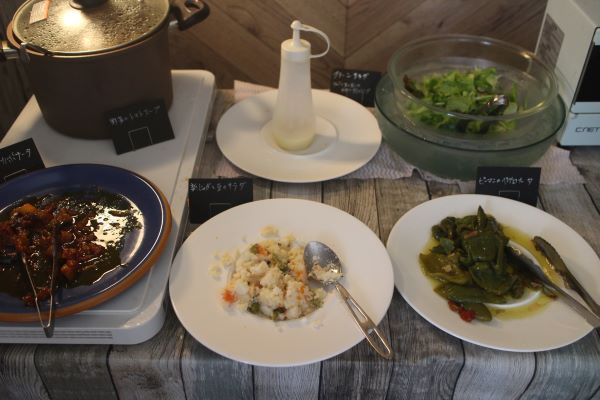 びっくりしたのはフリーで食べられるサラダ、スープ、フォカッチャ、野菜の前菜三種類 写真が少し見ずらくてスミマセン。野菜がたくさん食べられますね。 (トマトスープ グリーンサラダ 茄子の煮物 ジャガイモサラダ ピーマンの煮物)
