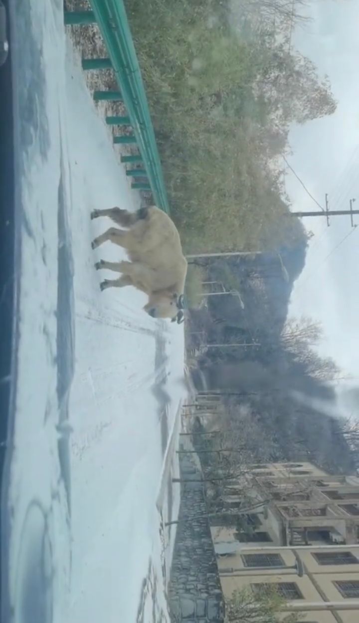 建物の門にやって来た撮影者さんの目の前には、白い毛に覆われた動物の姿がありました。 頭に太くて短い角がついたこの子は、ウシ科の動物「ターキン」と言います。
