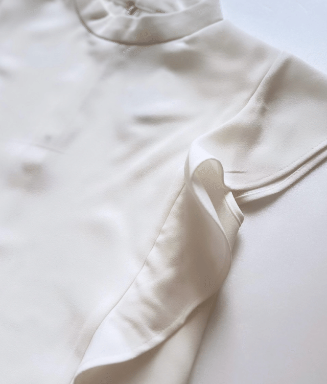 デザイン面では、大ぶりのラッフルフリル袖とスタンドカラーが特徴的です。フリルスリーブは二の腕をさりげなくカバーし、華奢なシルエットを演出する効果があります。