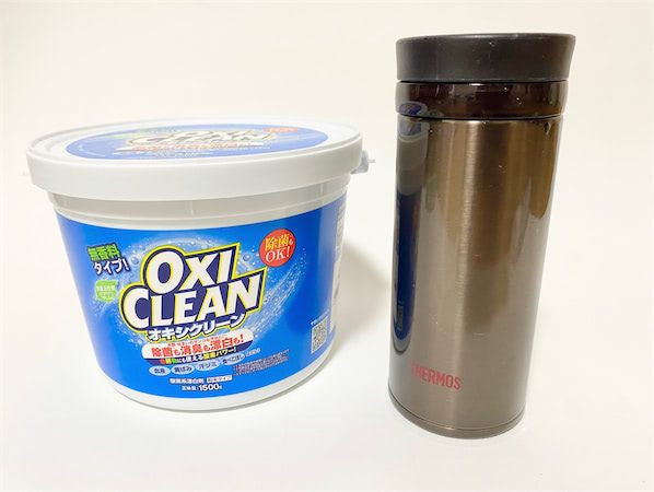 水筒全体をオキシ漬けすると、外側の塗装がはがれてしまう場合があります。オキシクリーンで水筒を洗浄する際は、内側のみにしてください。