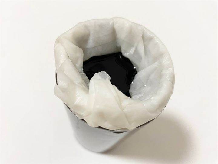 水筒にオキシ溶液を注ぎ、30分漬けておきます。今回はフチまでしっかりきれいにしたかったので、オキシ溶液を含ませたキッチンペーパーを巻いてパックしました。