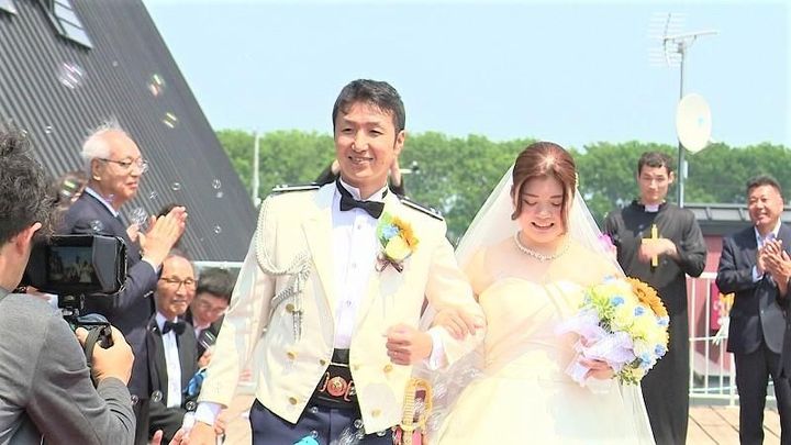 式を挙げたのは、この道の駅で働く新婦の佐藤萌貴(もえき)さん(24)と航空自衛隊に務める新郎の佐藤純平さん(39)。