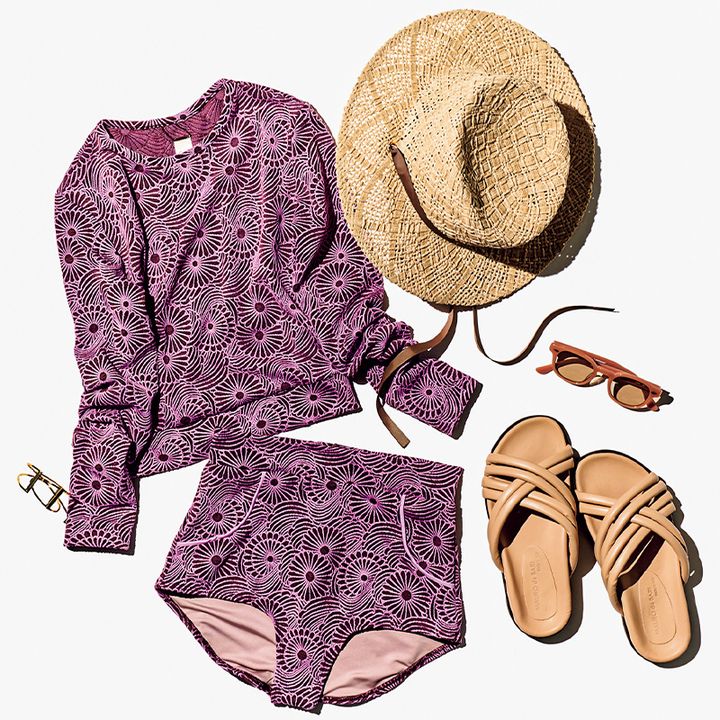 カリフォルニア発サーフブランドの水着は、海外らしい華やかな柄とシックな色合いが魅力です。厚手でストレッチ性があるので体のラインをぼかしつつも優しくフィットし、アクティブに動いてもズレにくいのが特徴。ラッシュガード、ボトムスはシーア、サンダルはマロウ・デ・バーリ、ハットはビーミング by ビームスのもの。
