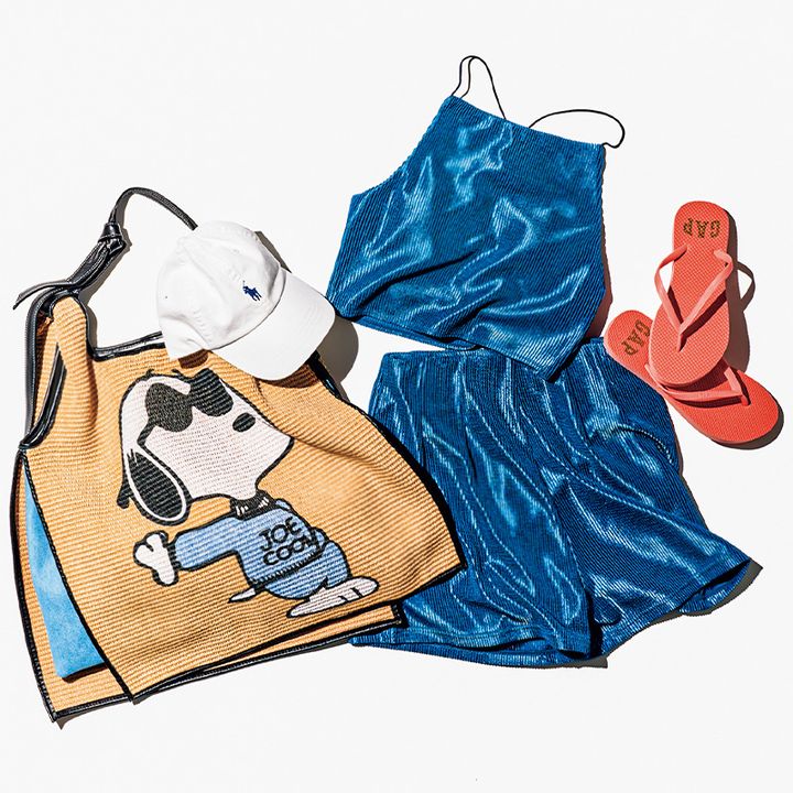 服のようなデザインのトップにボトム、ショートパンツのうれしい3点セット。ハーフパンツを着用したら、水から出た後もいろいろと活動できます。凸凹した表面感のある生地でフィット感がありボディラインを拾いにくいのもポイント。スイムウェアはemmi、バッグはアニタ ビラルディ、サンダルはGao、キャップはポロ ラルフ ローレンのもの。