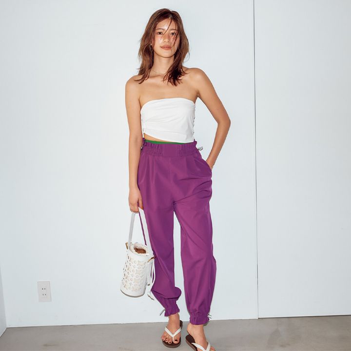 速乾素材のパラシュートパンツで海もプールも怖くない!ボトムがゆるいぶん、トップスはコンパクトにするのが良さそう。明るいカラーのパンツを選ぶと、よりリゾート気分が上がります。スイムトップス、ボトム、パンツはすべてOMMO、バッグはA VACATION、サンダルはげんぺいのもの。