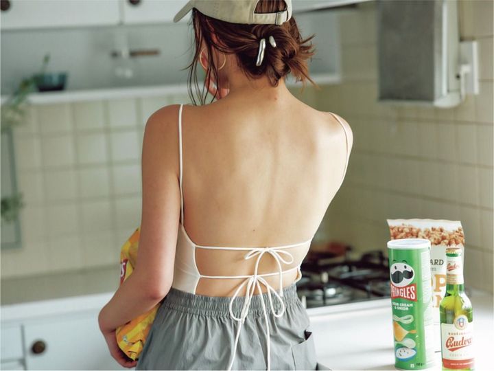 ワイドシルエットの撥水ハーフパンツがこなれて見える理由。ただの楽ちんスタイルにならないように、背中の開いたスイムワンピースを。肩や背中の華奢なストラップでヘルシーな色っぽさもプラスできます。スイムワンピースはSWELLY、ハーフパンツはATONのもの。