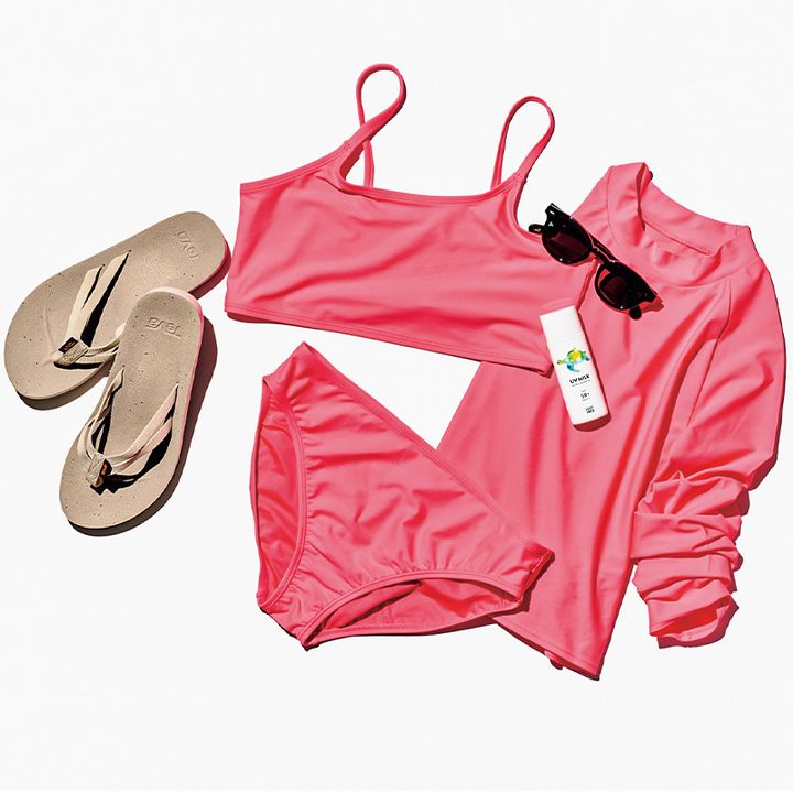 服見えする水際アイテムもいいけれど、ガッツリ水の中に入るならやっぱり水着が必要。あれこれ組み合わせを考える必要のない、“コンパクトなラッシュガード+スイ