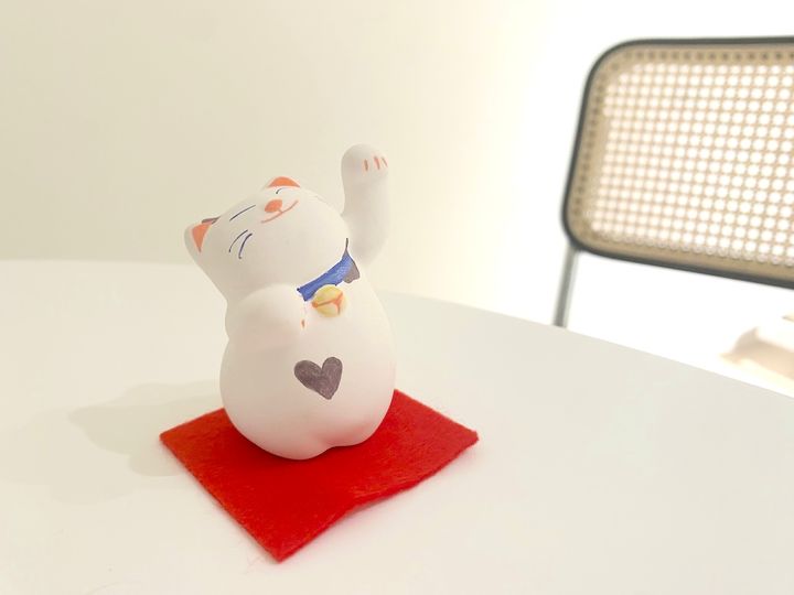 招き猫は生活するなかで目につきやすく明るい場所に置くのが、縁起がよくておすすめだそう。実際に家に持ち帰った筆者はリビングのテーブルの上に置いてみました。招き猫と一緒に赤い座布団が入っているので、座らせてあげるとしっくりきます。