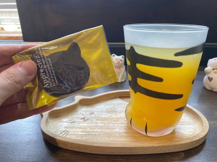 セットが到着したときにその見た目からキュン!トレーがお昼寝中の猫の形だったり、コップが猫足だったりと猫にまつわる形がたくさんでかわいすぎます。取材時のお菓子は、こちらも猫の形をしたココアクッキーでした。