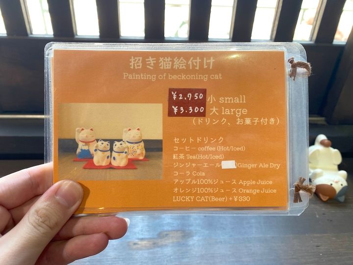 所要時間はおよそ1時間。料金は選ぶ招き猫のサイズで異なり、「小サイズ」2750円、「大サイズ」3300円です。体験には、お菓子とドリンクがセットになっていて、お菓子はクッキーやマドレーヌなどからランダムで提供。ドリンクはコーヒーや紅茶、オレンジジュースなど6種類のなかからセレクトできます。追加料金330円を支払えば、「ラッキーキャット」というかわいいネーミングのビールも選択可能です。