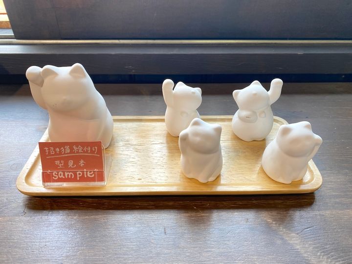 まずは招き猫の形を決めるところからスタート。「カフェ猫衛門」の絵付けに使われる招き猫はすべてオリジナルの型で作られた陶器です。サイズが大・小の2種類あり、さらに小サイズは左手上げと右手上げそれぞれ2種類。金運を招くとされる右手上げ、人を招くとされる左手上げ、いまの自分に必要だと思うものを実際に手に取りながらチョイスしてみて。