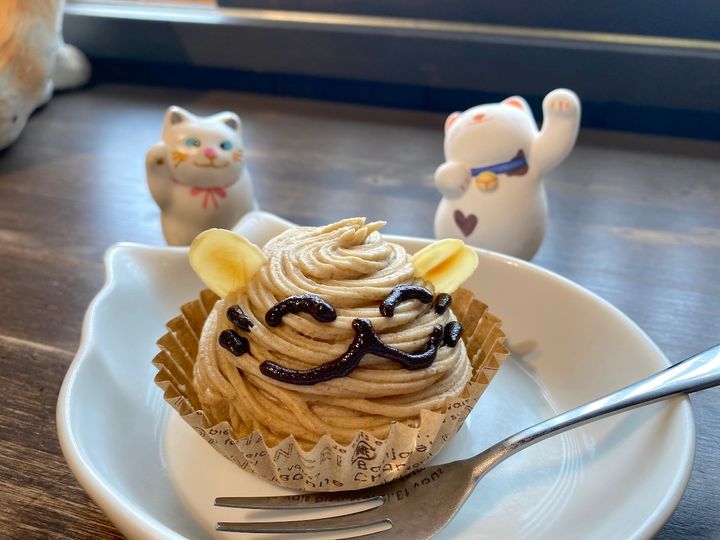 「黒猫のモンブラン」は、猫がにっこりと微笑むビジュアルの手作りモンブラン。国産和栗を使用した舌触りのいい栗ペーストは、ほのかな甘さでチョコレートとの相性ぴったり。中には生クリームとスポンジが入っていますよ。小さめサイズで食べやすいのも魅力です。