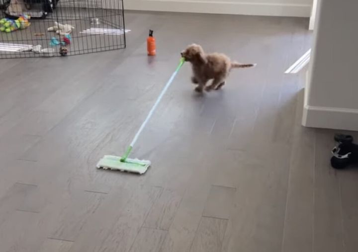 3. お掃除の時間だっ! モップを持って張り切る子犬が可愛い♪