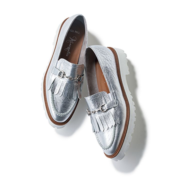 軽快な足元を演出するシルバー。デイリーユースに最適な晴雨兼用タイプ。ローファー¥25,300(銀座かねまつ/銀座かねまつ6丁目本店)