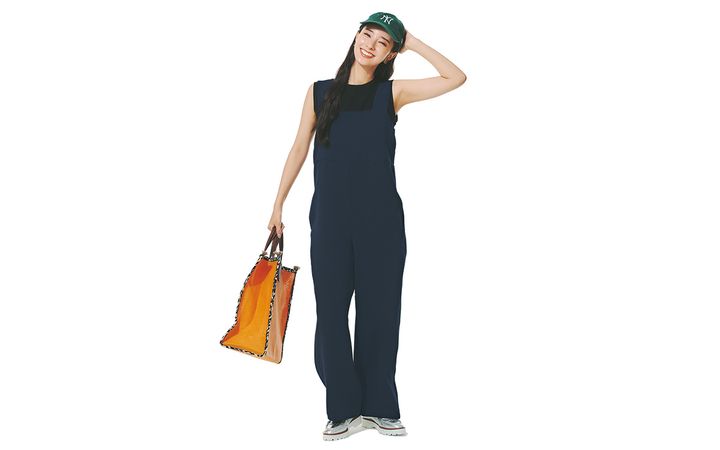 汗をかいても快適。高めの切り替え位置でぺたんこ靴でも脚長見え。サロペット¥25,300(ユナイテッドアローズ/ユナイテッドアローズ渋谷スクランブルスクエア店)