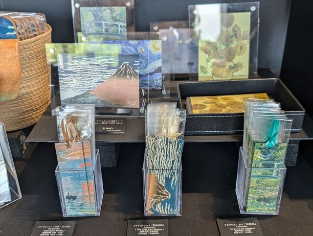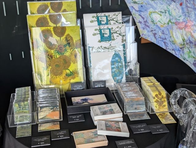 特設ショップでは、ゴッホやモネ、北斎らの絵が使われたグッズを購入することができます。ファイルやしおり、ポストカードなどの雑貨から、傘やタオルなどの日用品まで、絵画を日常生活に取り入れることができるグッズがもりだくさん。