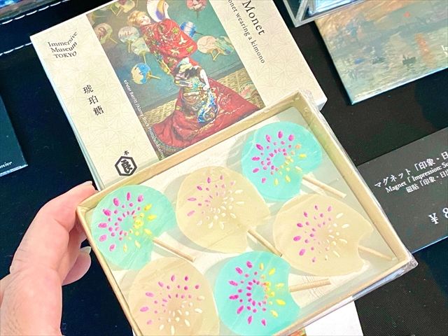 こちらはモネの『ラ・ジャポネーズ』をモチーフにした琥珀糖(税込1,400円)。絵の背景にもあるうちわ型になっており、色鮮やかで可愛いデザインです。