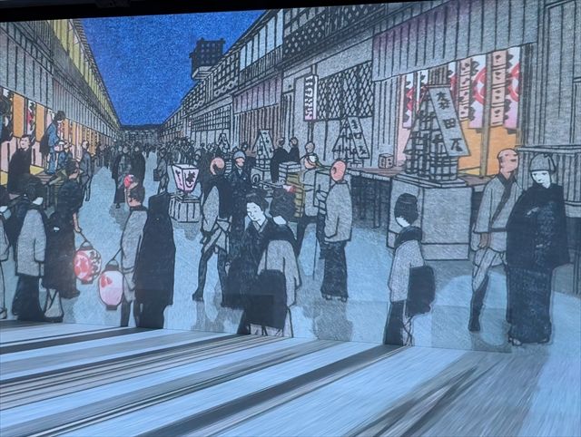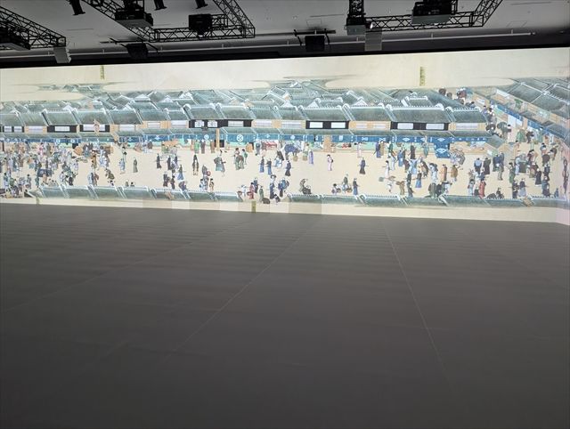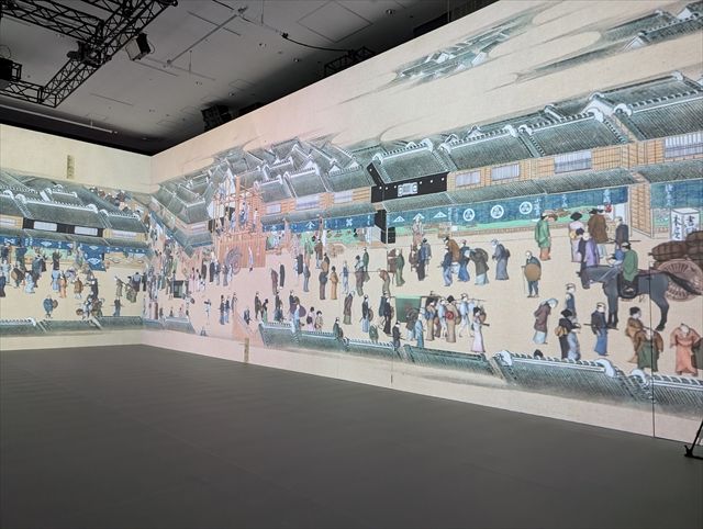 浮世絵の中に描かれている人物が一人ひとり動いていて、高台から江戸の町を眺めているような感覚に。和を感じさせてくれるBGMに、にぎやかな人々の声や馬の足音など、環境音が「熈代勝覧」の世界へと没入させてくれます。