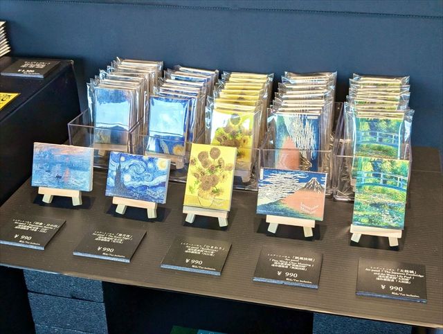 前回から引き続き販売しているミニアートパネル(税込990円)。今回はゴッホ、モネ、北斎の作品から5種類の絵が小さなキャンバスになっています。