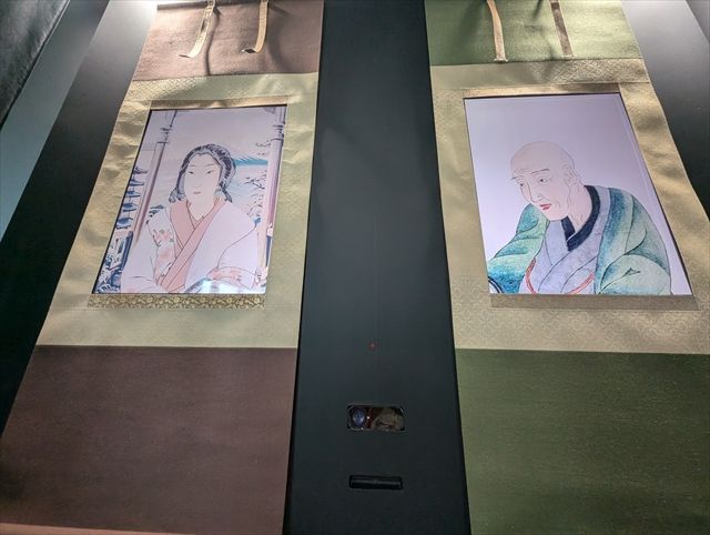 体験スペースに座ると、北斎に出身地を聞かれます。それに答えると浮世絵の作成がスタート。完成した浮世絵は、出身地を象徴した背景と、自身の似顔絵が北斎風のタッチで描かれています。