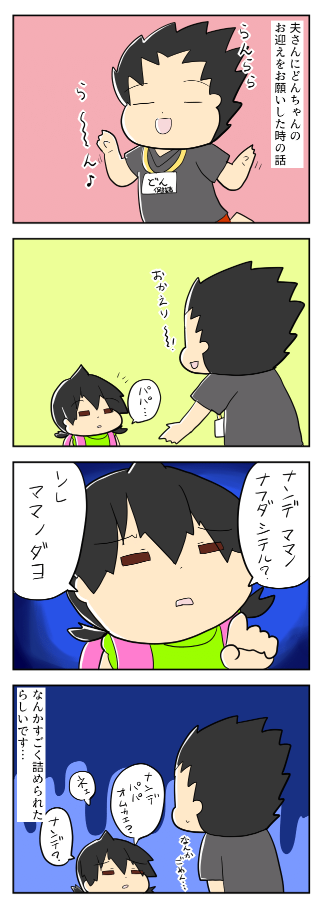 どんちゃんからの質問攻めにパパさんタジタジですね。パパのお迎えが嫌だったわけではなく、純粋に「ママの名札をつけているパパ」が気になってしまったのでしょうね(笑)