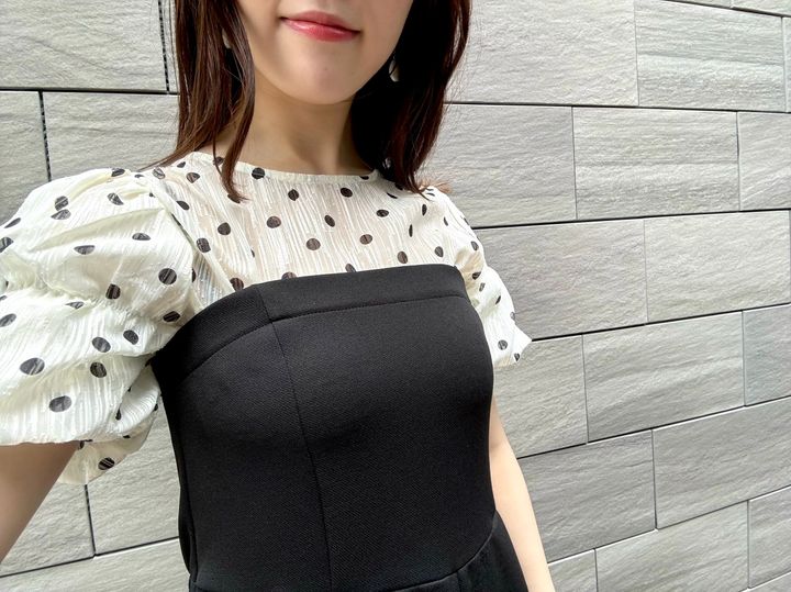 LOOK 1とはガラッと印象を変えて、ドットのパフスリーブブラウスをイン!