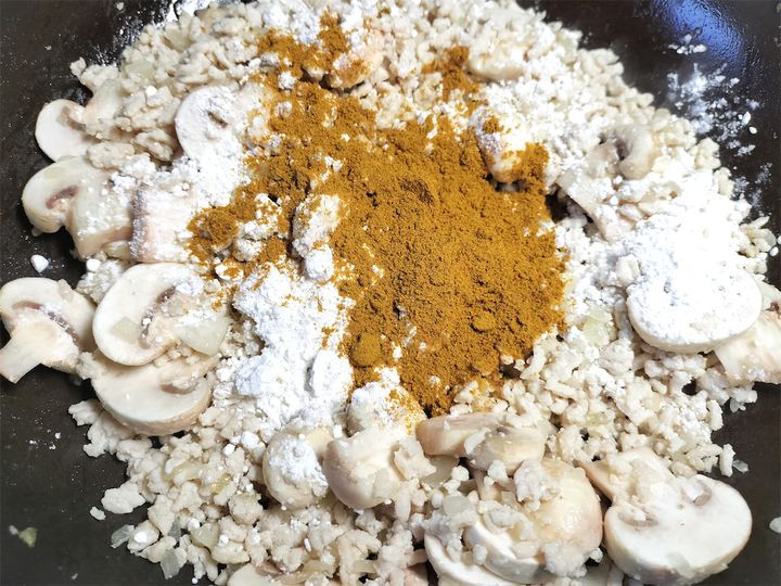 5. さらに小麦粉とカレー粉を加えて、粉っぽさがなくなるように混ぜながらよく炒めます。